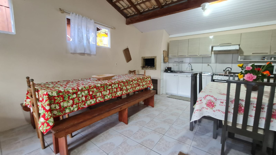 Cozinha grande com 2 mesas e churrasqueira